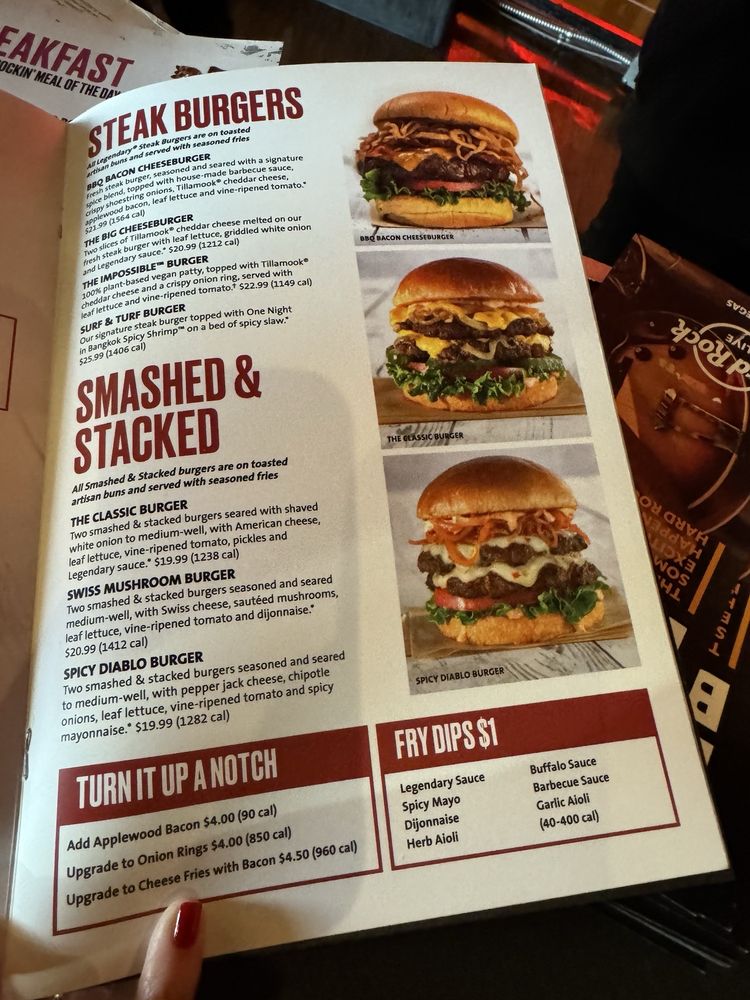 Two smashed & stacked burgers seared with shaved white onion to medium-well, with American cheese, leaf lettuce, vine-ripened tomato, pickles and Legendary sauce.